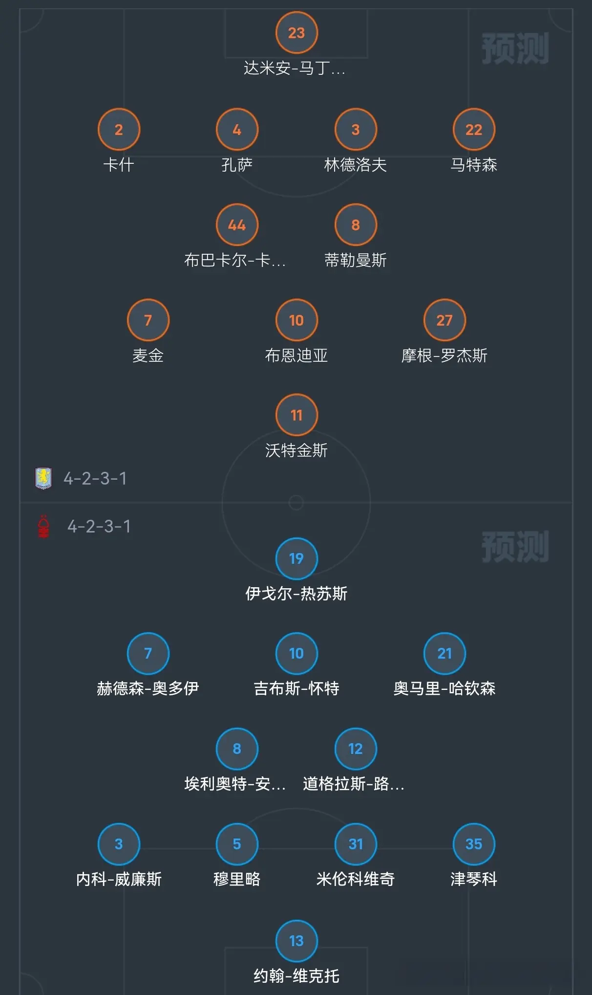 本场比赛维拉队的卡马拉和卡什皆将解禁复出,埃梅里可以排出最强声势出战,预测两队的首发声势如下。