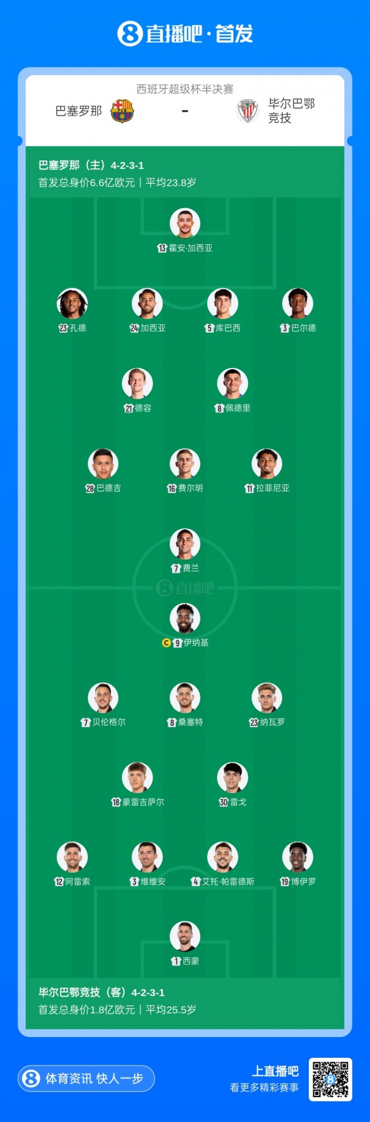 西超杯-巴萨vs毕尔巴鄂首发:亚马尔、尼科均替补!巴德吉先发