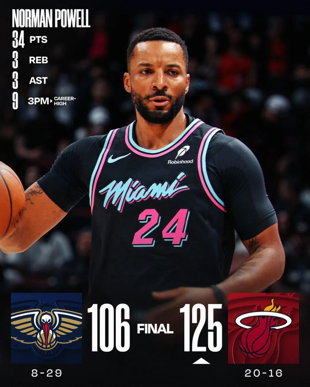 拿上一场比赛来说,热火主场125-106大捷鹈鹕,鲍威尔全场只打了不到29分钟,投篮15中11,三分12中9,罚球4中3,得到34分3篮板3助攻2抢断。